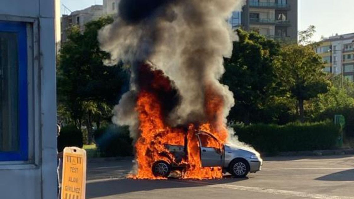 Diyarbakır’ın Bağlar ilçesindeki araç muayene istasyonuna giden şoför, arabası muayeneden geçmeyince yaktı.