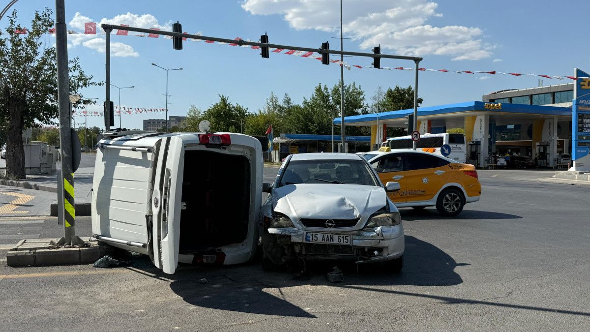 Çarpışma tesiriyle hafif ticari araç yan yattı.