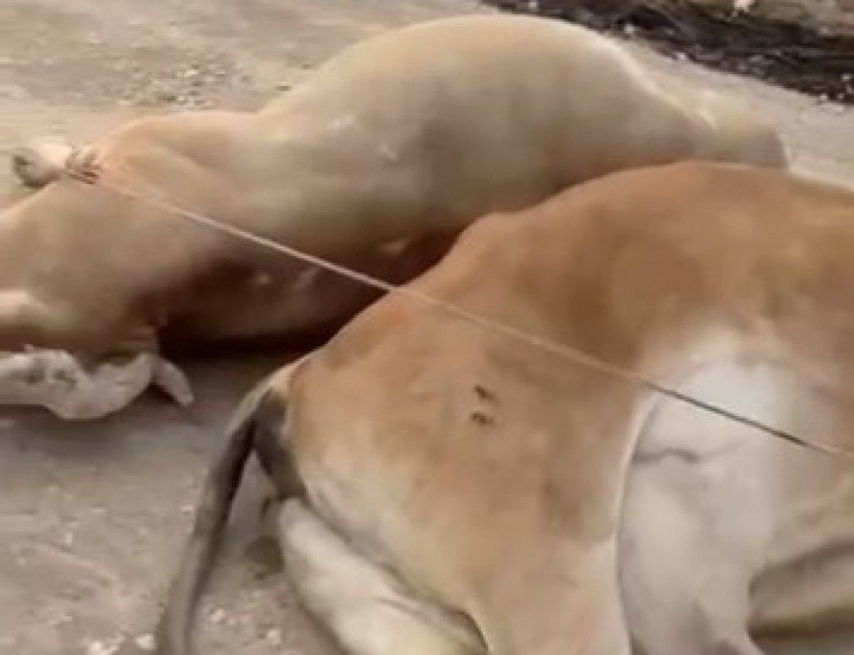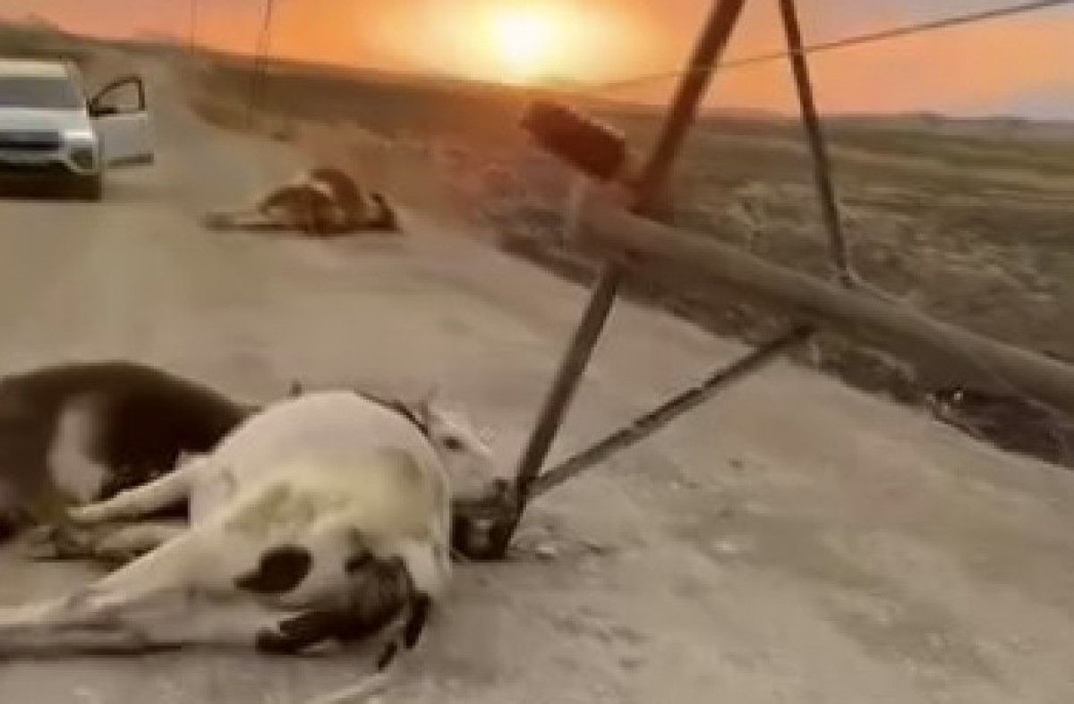 Devrilen direğin telleri yoldaki ineklerin üzerine düştü.