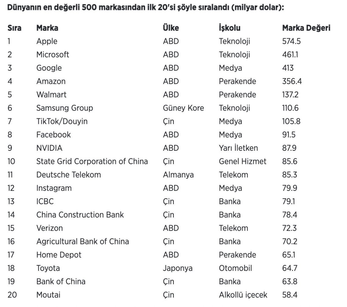 Brand Finance’ın “Dünyanın En Değerli 500 Markası” çalışmasında zirve değişmedi.