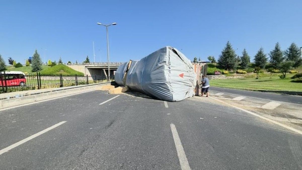 D-100 kara yolu Kervan kavşağı İstanbul istikametinde yaşanan kazada Kadir K. yönetimindeki DAF marka tır, şoförünün direksiyon hakimiyetini kaybetmesi sonucunda denetimden çıkarak devrildi.