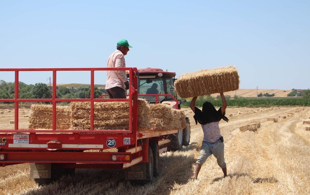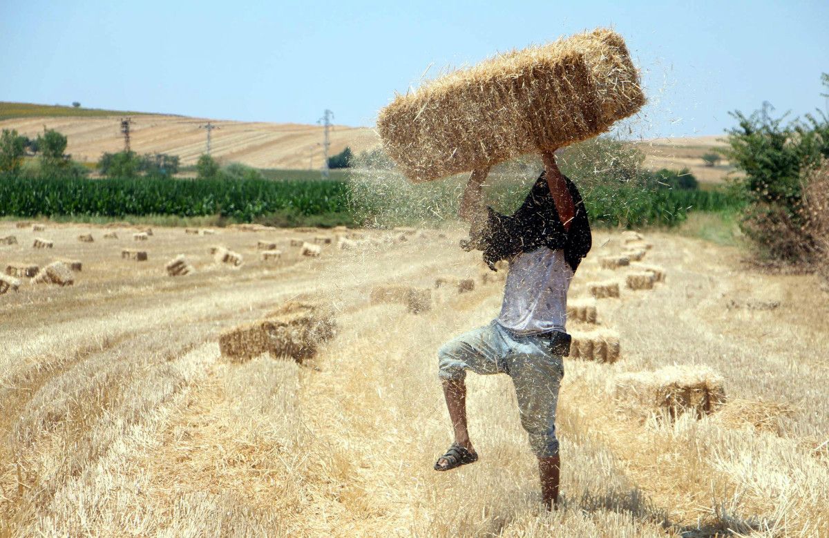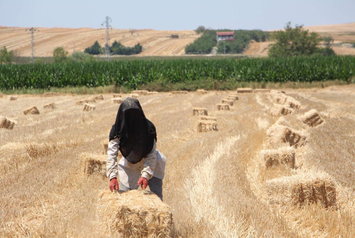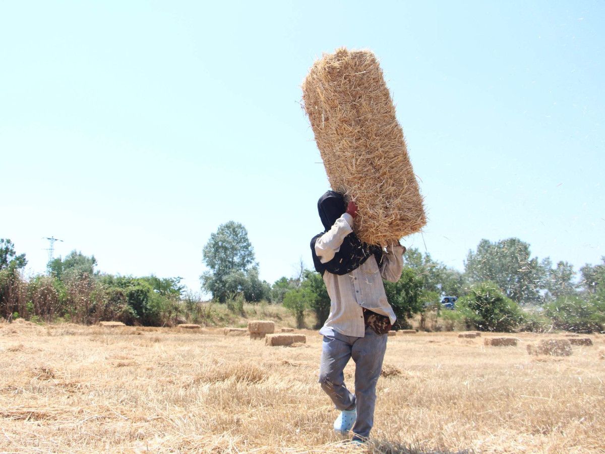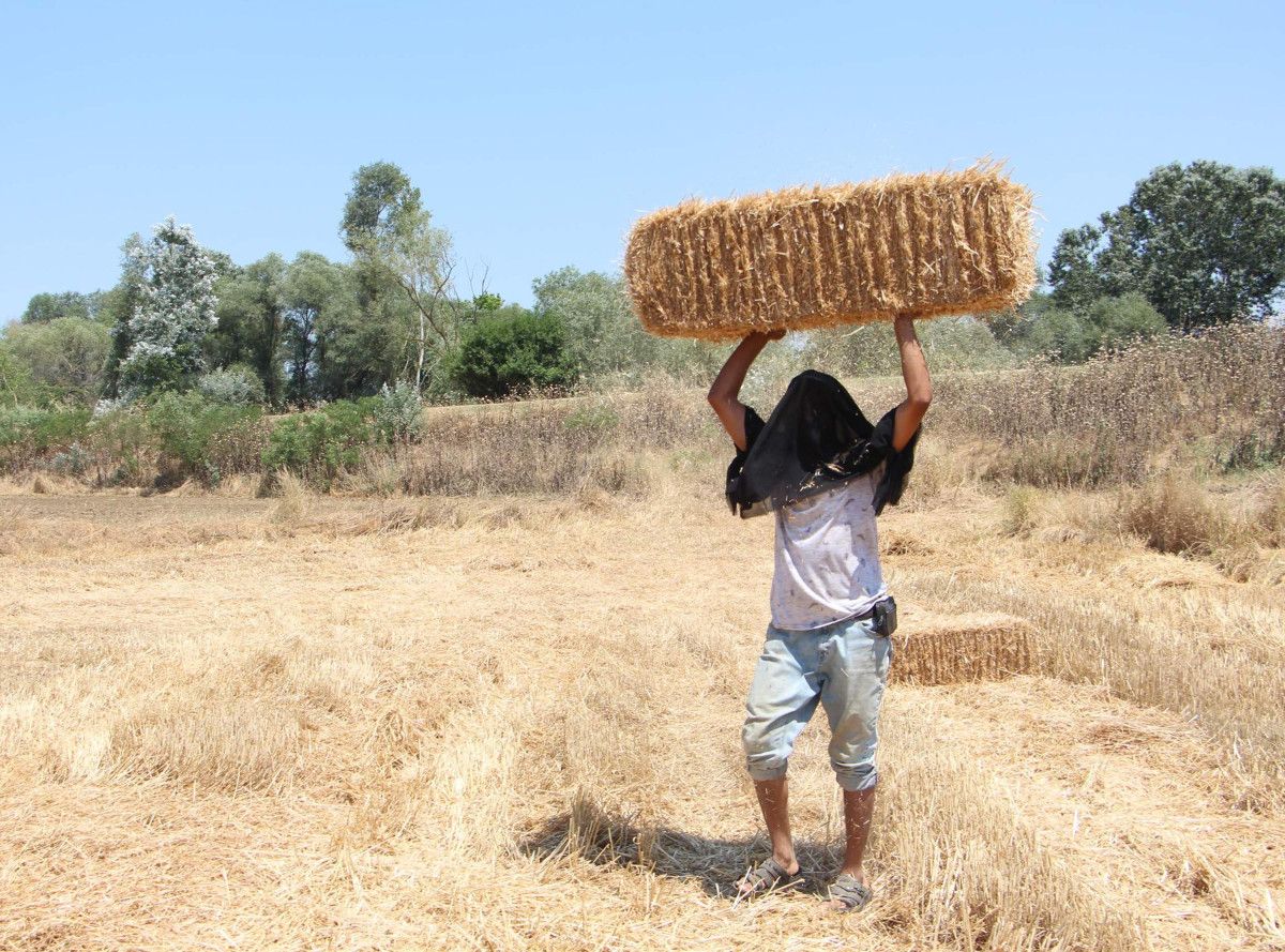 İşçiler, tanesi 15 liradan balya taşıyarak günde ortalama 3 bin lira kazanıyor. Kuvvetli mesaide emekçiler, sıcak ve tozdan korunmak için başlarına tülbent bağlayarak çalışıyor.