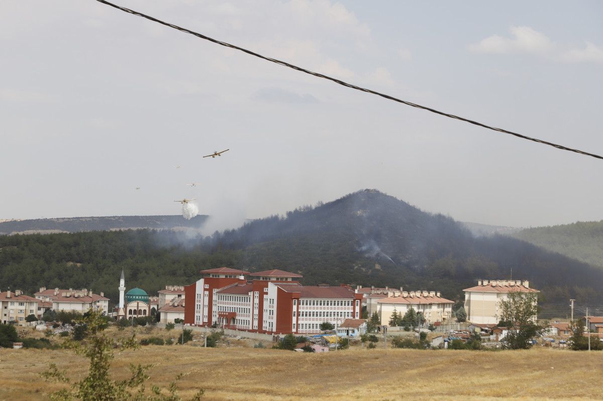 İtfaiye takımlarının söndürme çalışmalarına 2 helikopter de havadan takviye veriyor.