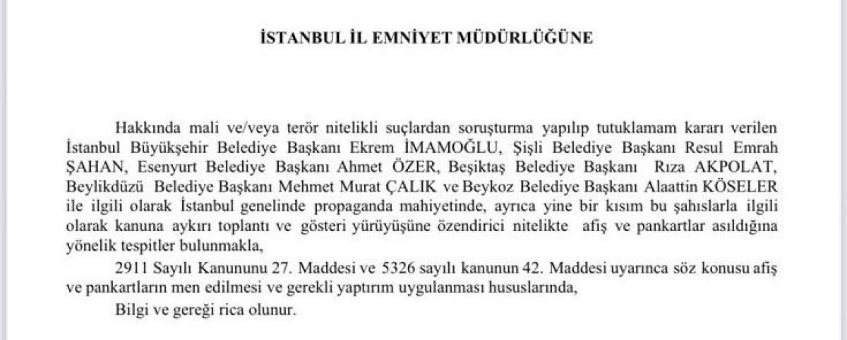 Başsavcılık tarafından yapılan incelemede, yolsuzluktan tutuklanan ve vazifesinden uzaklaştırılan Ekrem İmamoğlu’nun da bulunduğu birtakım belediye liderleri hakkında İstanbul genelinde propaganda ve ilgili kanuna ters toplantı ve şov yürüyüşüne özendirici nitelikte afiş ve pankartlar asıldığı tespit edildi.