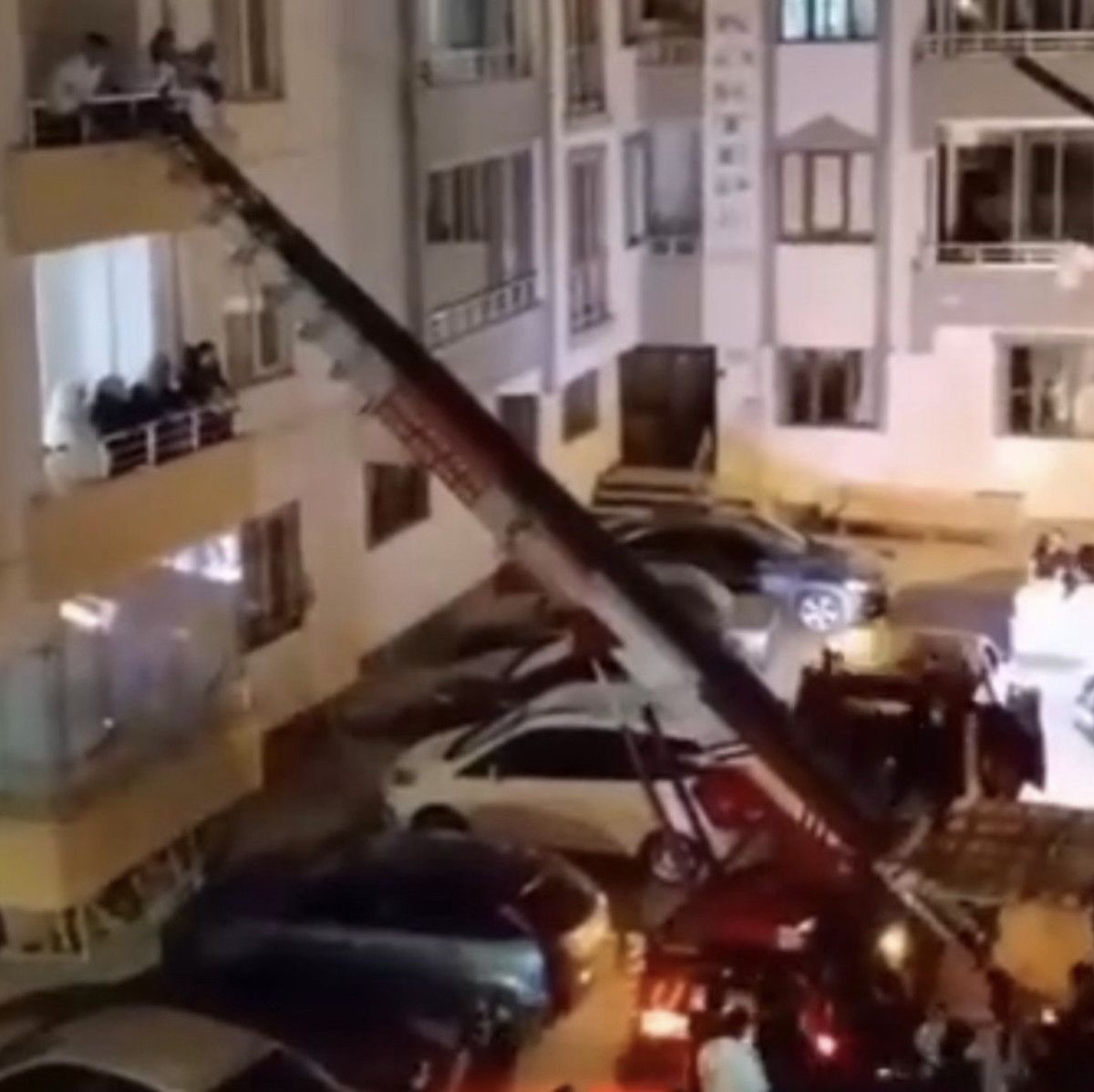 Pes etmeyen damadın arkadaşları, binanın önüne konuşlandırılan yük asansörüne binerek balkona ulaştı.
