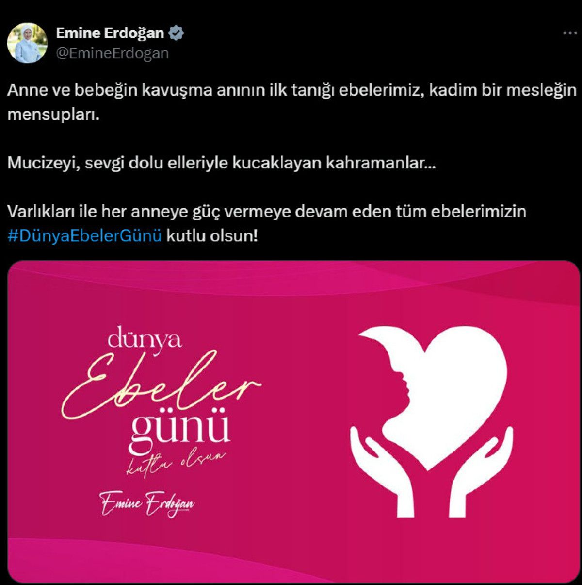 Bu kapsamda Cumhurbaşkanı Recep Tayyip Erdoğan’ın eşi Emine Erdoğan, toplumsal medya hesabından Dünya Ebeler Günü’ne ait paylaşımda bulundu.