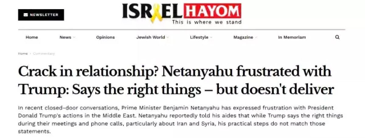Gazetenin, “Netanyahu, Trump’tan bıktı. Hakikat şeyleri söylüyor ancak yerine getirmiyor” başlığıyla yayınladığı haberde Netanyahu, Trump’ın Orta Doğu siyasetinden son derece rahatsızlık duyduğu aktarıldı.