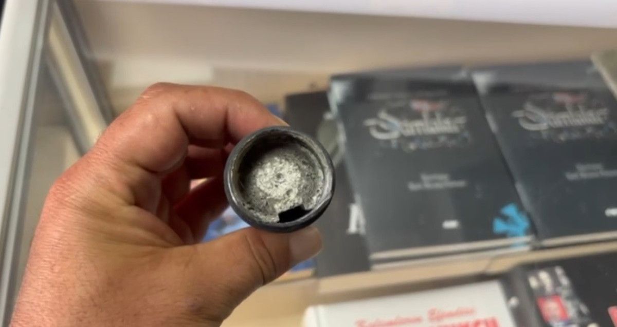 Kutuyu açıp eseri ayrıntılı incelediğinde, mikrofonun içine yük katmak gayesiyle beton döküldüğünü fark eden vatandaş, o anları cep telefonu kamerasıyla kaydetti.
