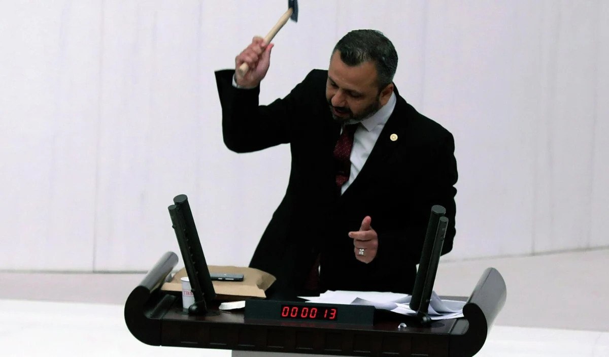 Ancakkonuşma sırasında Erbay, kürsüye koyduğu cep telefonunu çekiçle kırdı.