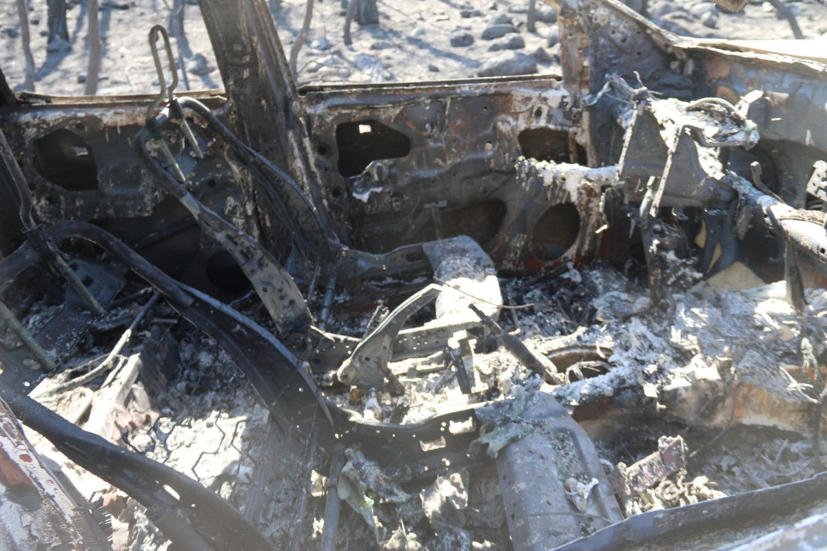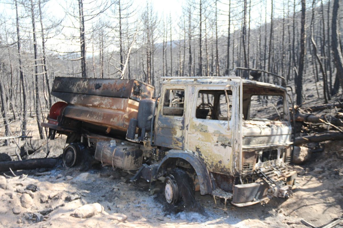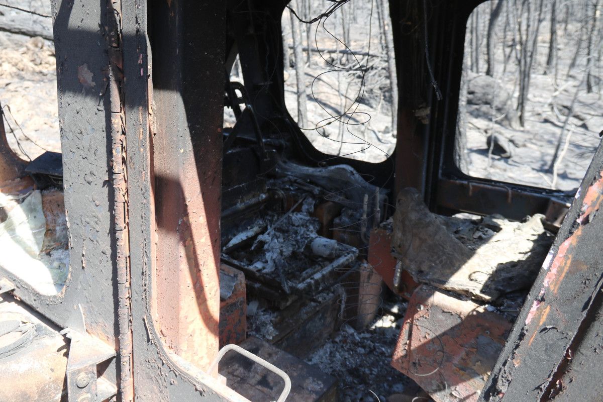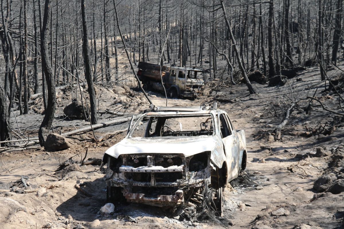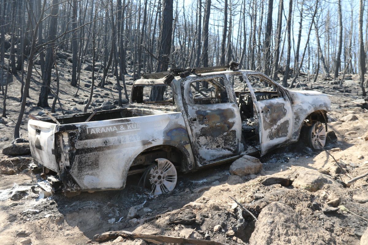 Geride kalan Eyüp Dereli’nin kullandığı dozer, Tolunay Kocaman’ın kullandığı arazöz ve AKUT grubuna ilişkin pikap aracının demir yığınına dönmüş halleri yangının şiddetini bir defa daha gözler önüne serdi.