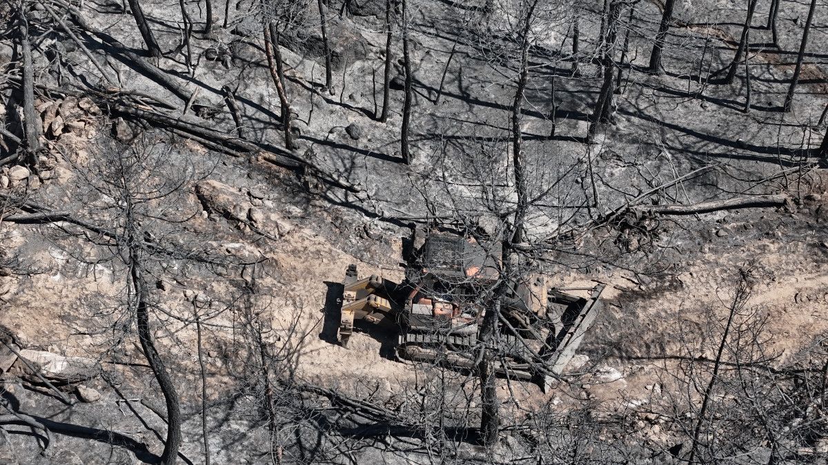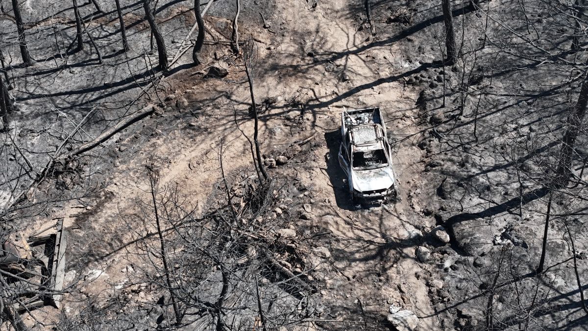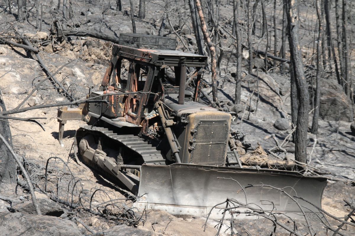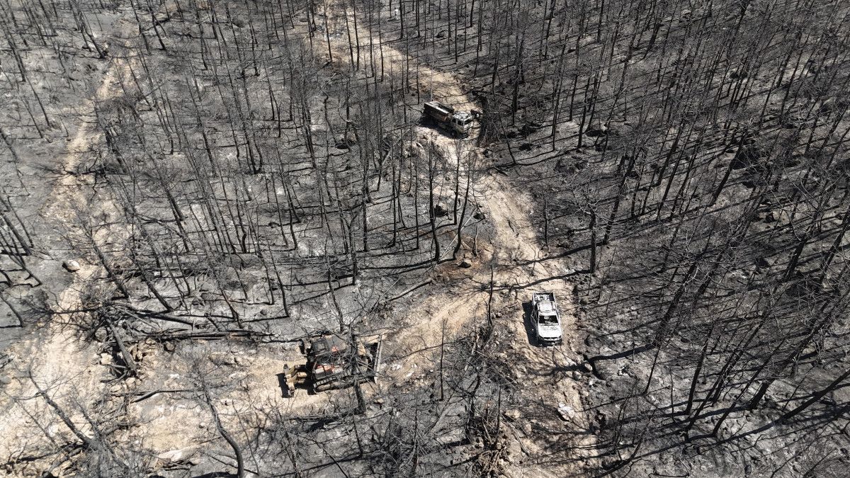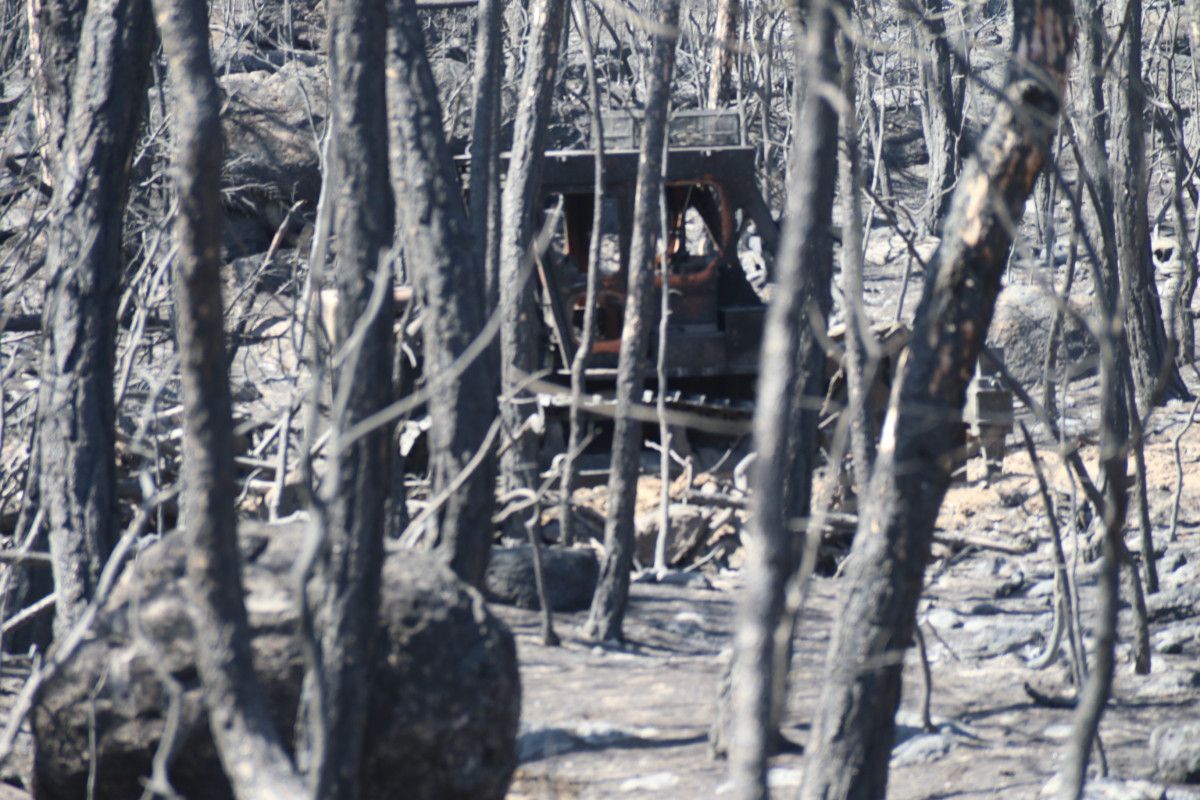 Geride kalan Eyüp Dereli’nin kullandığı dozer, Tolunay Kocaman’ın kullandığı arazöz ve AKUT grubuna ilişkin pikap aracının demir yığınına dönmüş halleri yangının şiddetini bir defa daha gözler önüne serdi.