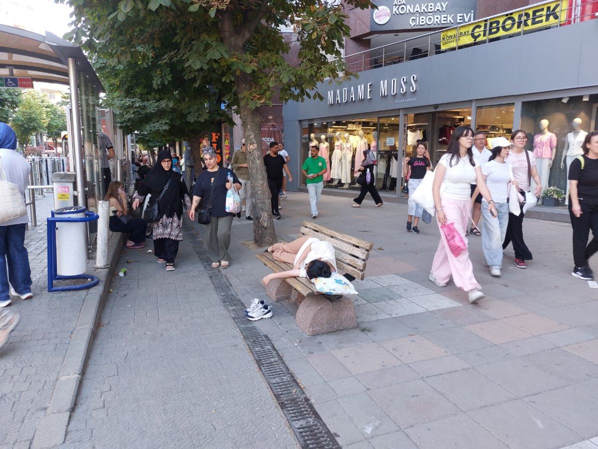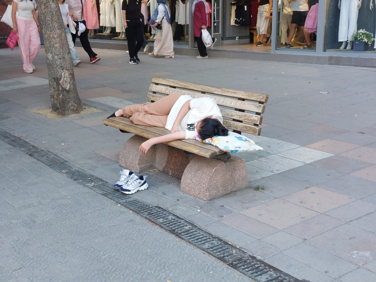 Kent merkezinde cadde üzerindeki tramvay durağının gerisinde yer alan gölgelik bankta bir genç, başının altına yastık koyarak uzandı ve uyumaya başladı.