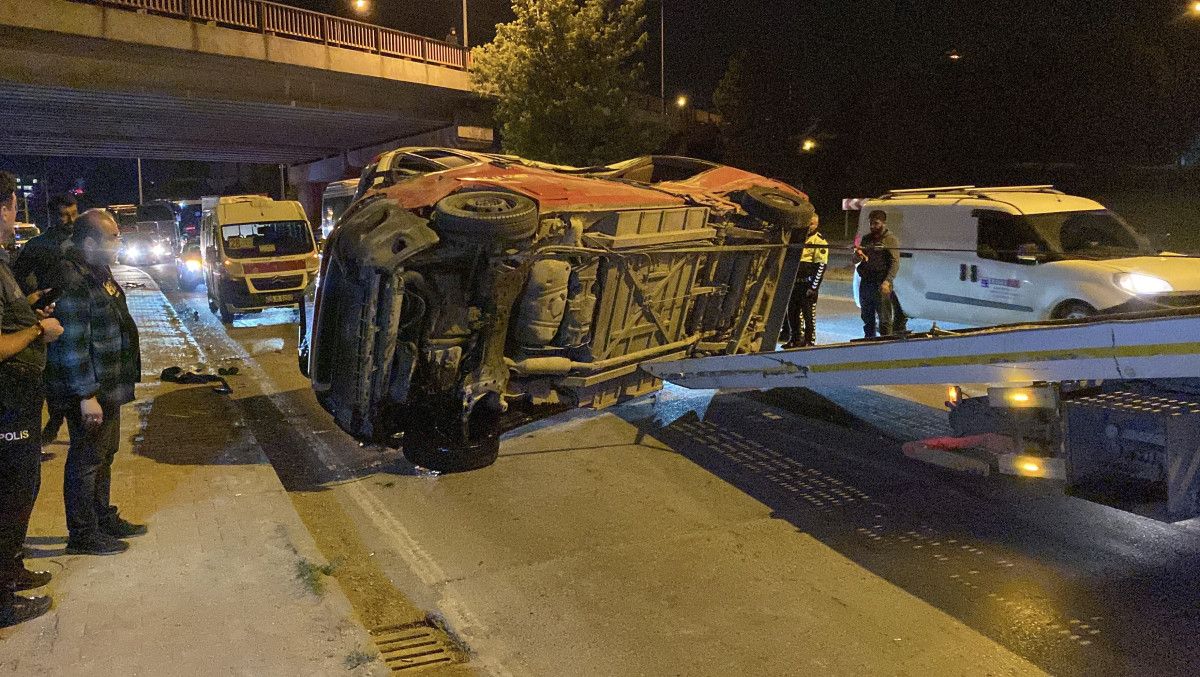 Sağ şeritte yana gerçek yatık halde bulunan minibüs, alımlı yardımıyla yoldan kaldırıldı.