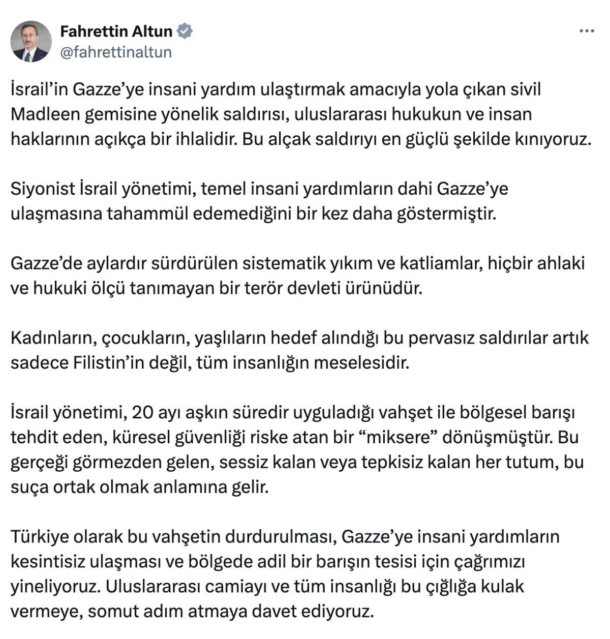 Cumhurbaşkanlığı İletişim Başkanı Fahrettin Altun, İsrail’in Gazze’ye insani yardım ulaştırmak için yola çıkan ve 12 insan hakları savunucusu aktivistin bulunduğu Madleen gemisine saldırısına reaksiyon gösterdi.