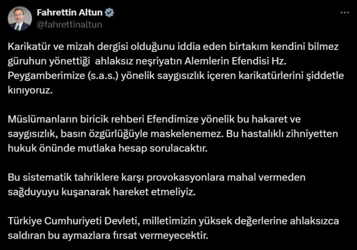 Müslümanların biricik rehberi Efendimize yönelik bu hakaret ve saygısızlık, basın özgürlüğüyle maskelenemez. Bu hastalıklı zihniyetten hukuk önünde kesinlikle hesap sorulacaktır.