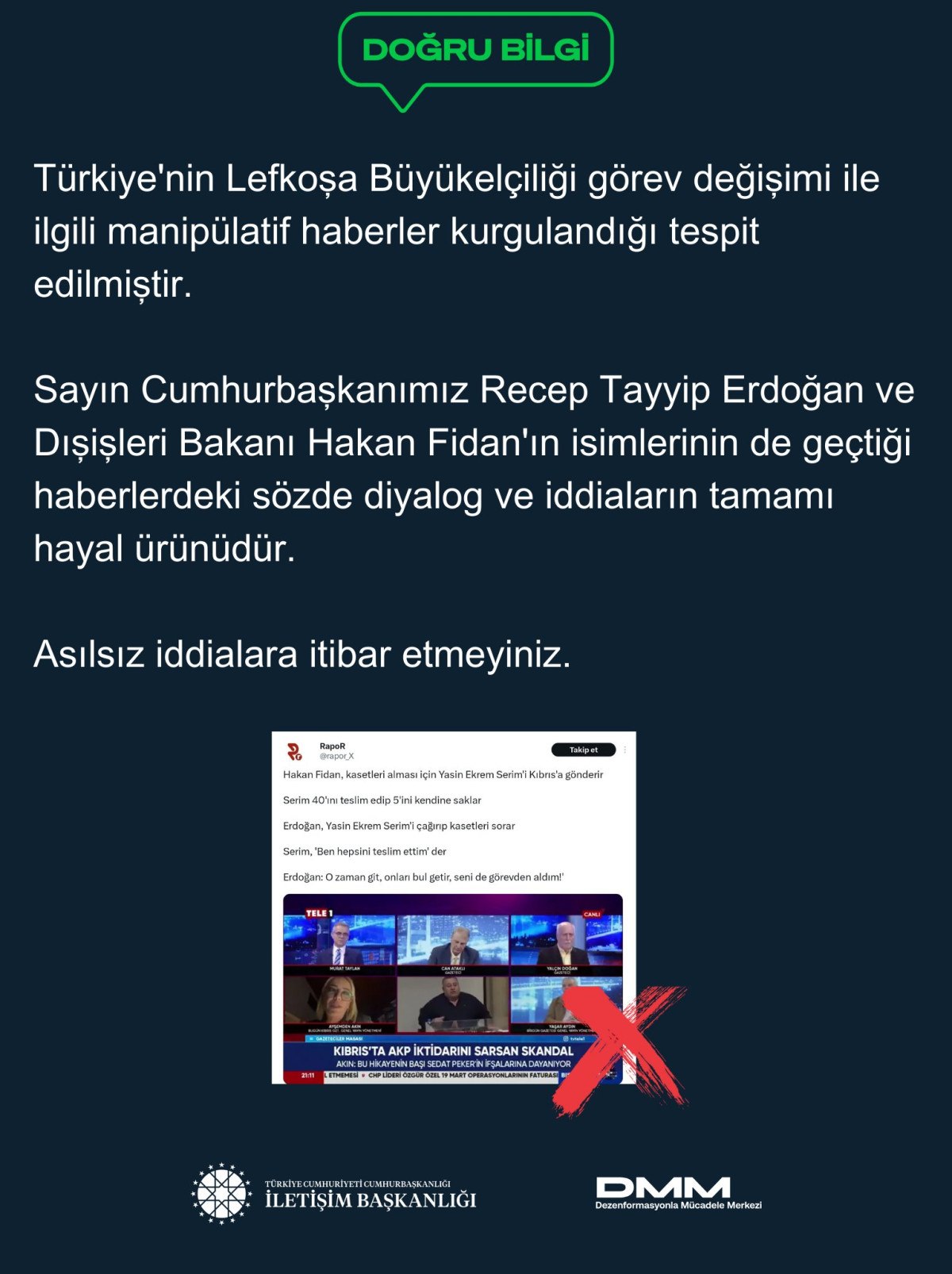 Sayın Cumhurbaşkanımız Recep Tayyip Erdoğan ve Dışişleri Bakanı Hakan Fidan’ın isimlerinin de geçtiği haberlerdeki sözde diyalog ve iddiaların tamamı hayal ürünüdür.