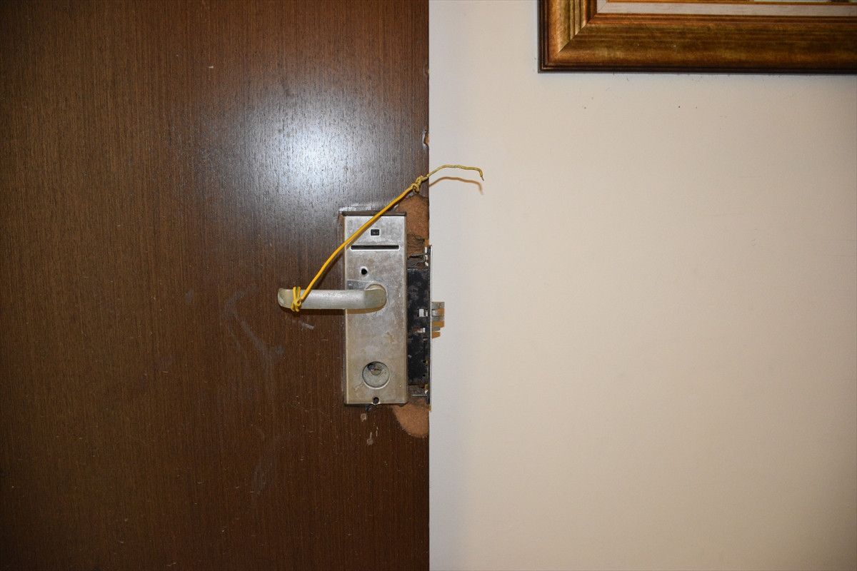 Suikast timinin saldırısı sırasında çatışmanın yaşandığı otel odasında darbecilere karşı koyan bir müdafaa polisine ilişkin kelepçe, kan izleri bulunan yatağın üzerinde dururken bir kanepenin üzerinde 18 kurşun izi dikkatleri çekiyor.