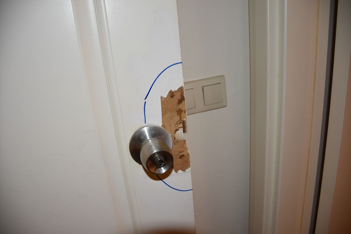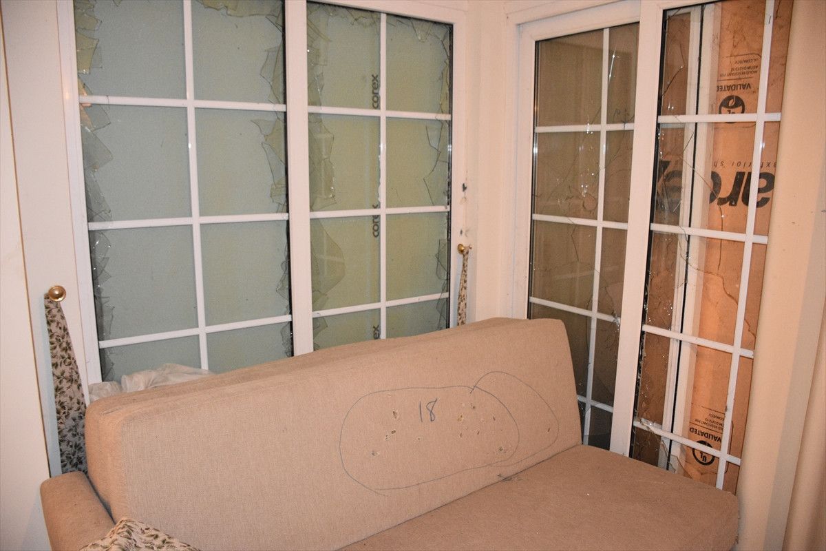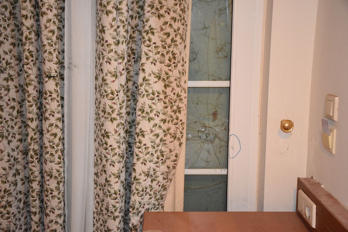 Saldırının en ağır yaşandığı odaların birindeki kırık pencereler ise dış cephenin kartonpiyerle kaplanmasıyla kamufle edilmiş durumda.