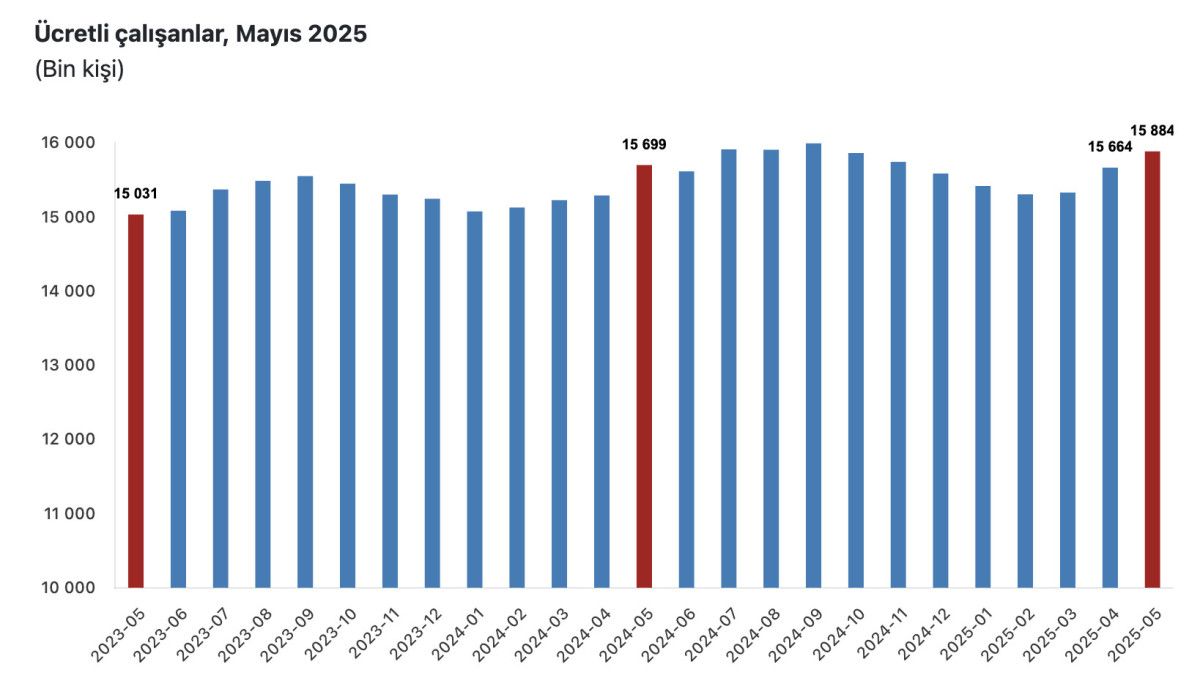 Ücretli çalışan sayısı bir evvelki yılın tıpkı ayında 15 milyon 698 bin 674 kişi iken, 2025 yılı Mayıs ayında 15 milyon 883 bin 683 kişi oldu.