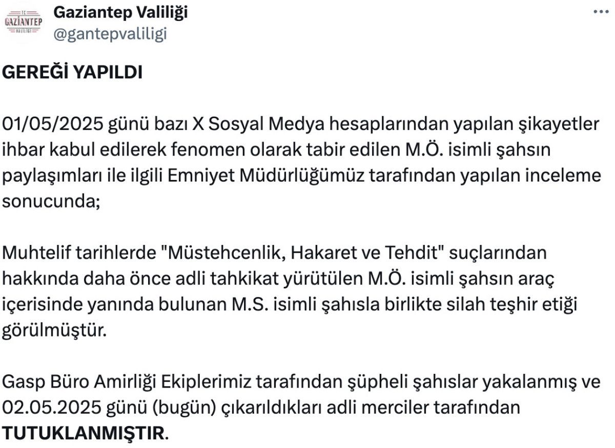 Gaziantep Valiliği’nden yapılan açıklamaya nazaran, toplumsal medya platformu X üzerinden M.Ö. arkadaşı M.S. ile dün silah teşhir ettiği görüntüleri paylaştı.