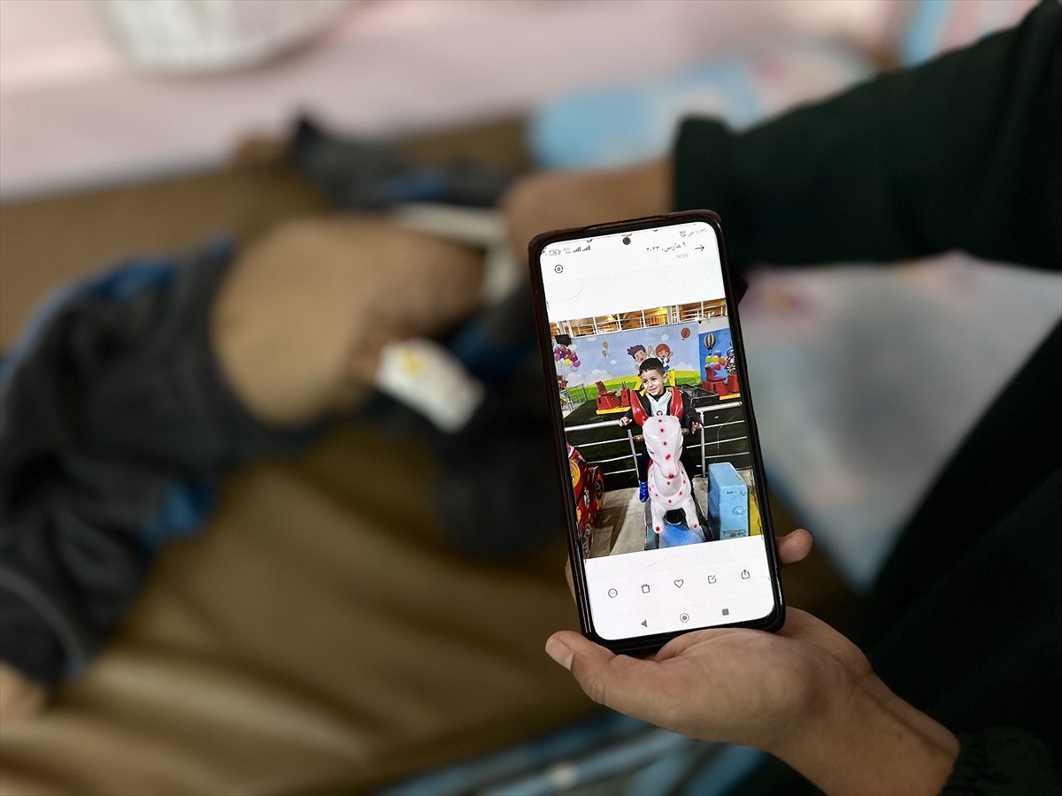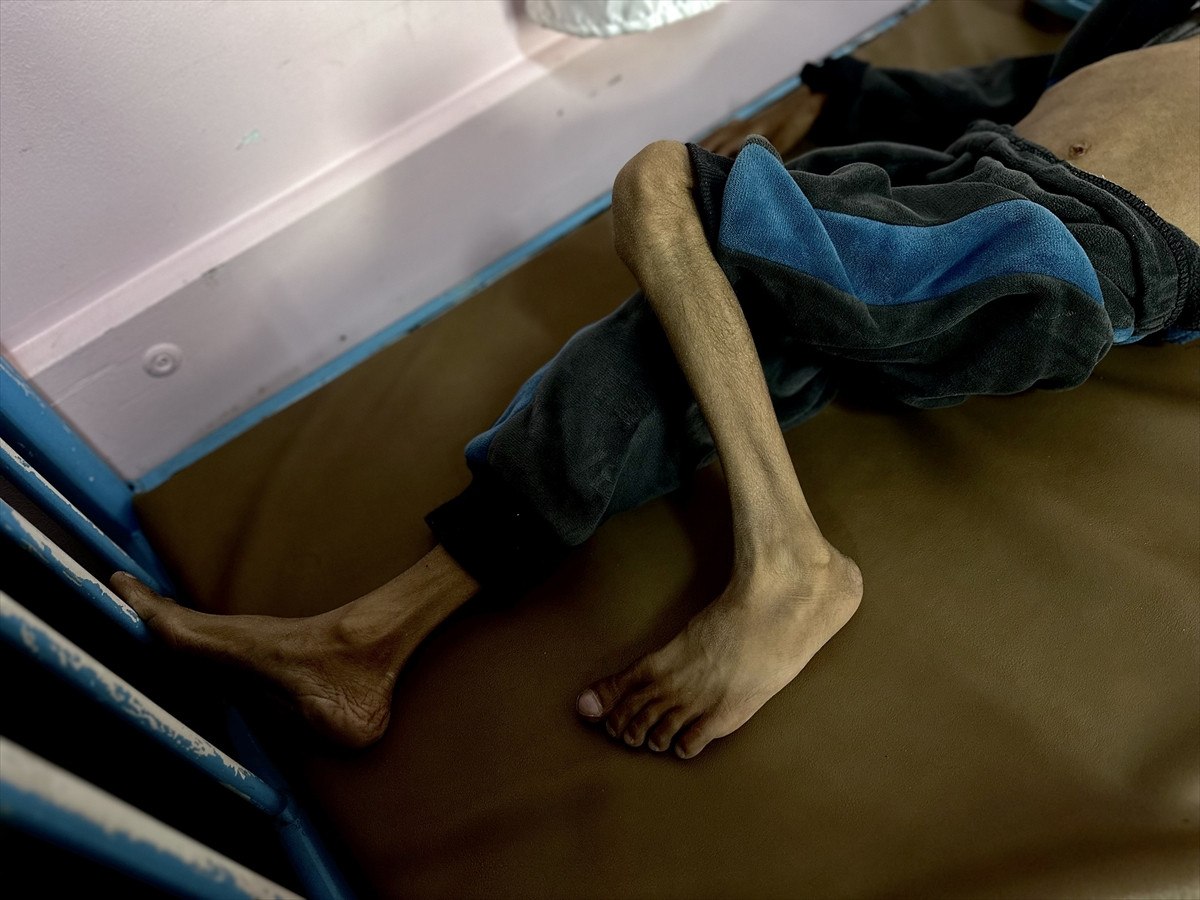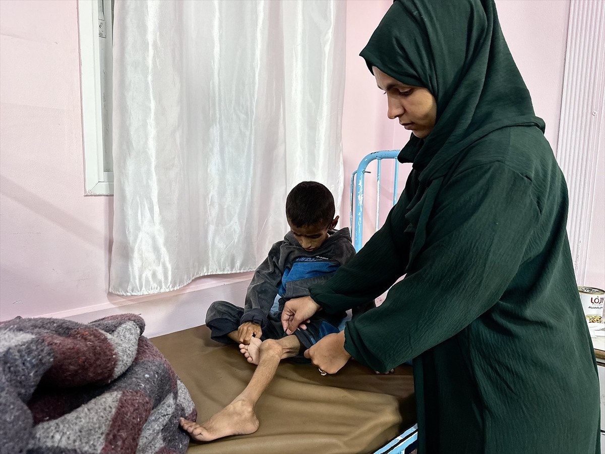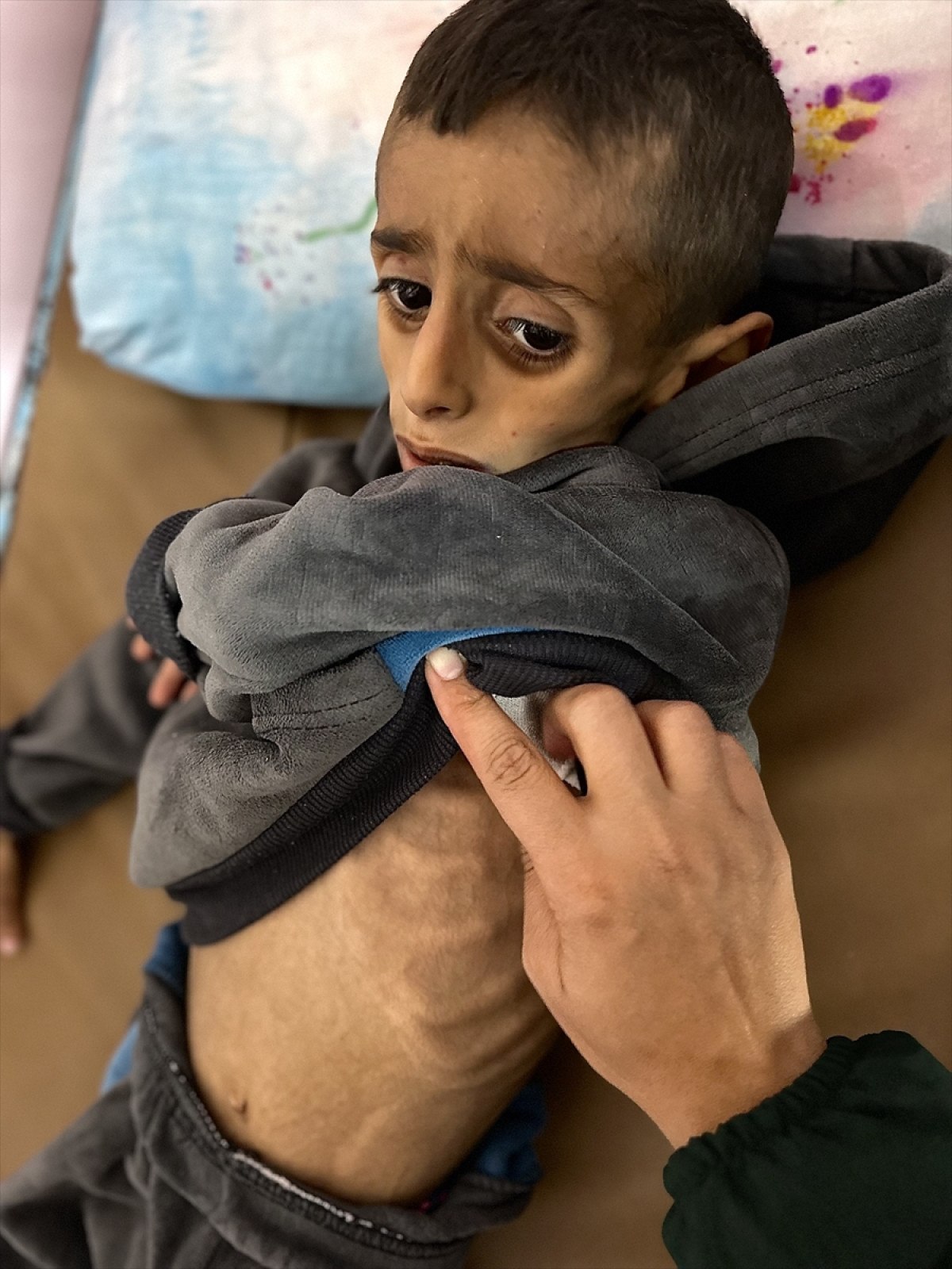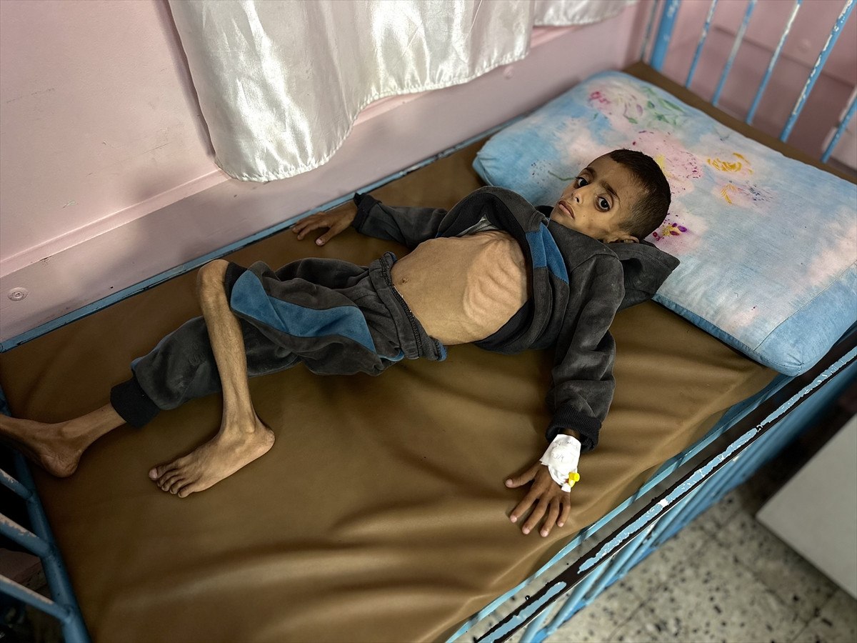 Osama El Rakab adlı Filistinli çocuk, yetersiz beslenmeye bağlı vücut zayıflığı sorunlarıyla Gazze kentinin güneyinde yer alan Han Yunus kentindeki Nasır Hastanesi’nde yaşam mücadelesi veriyor.