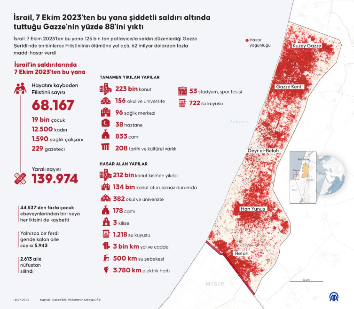 İsrail, 7 Ekim 2023’ten bu yana 125 bin ton patlayıcıyla atak düzenlediği Gazze Şeridi’nde on binlerce Filistinlinin vefatına yol açtı, Gazze’nin yüzde 88’ini yıkıma uğrattı ve 62 milyar dolardan fazla maddi hasar verdi.