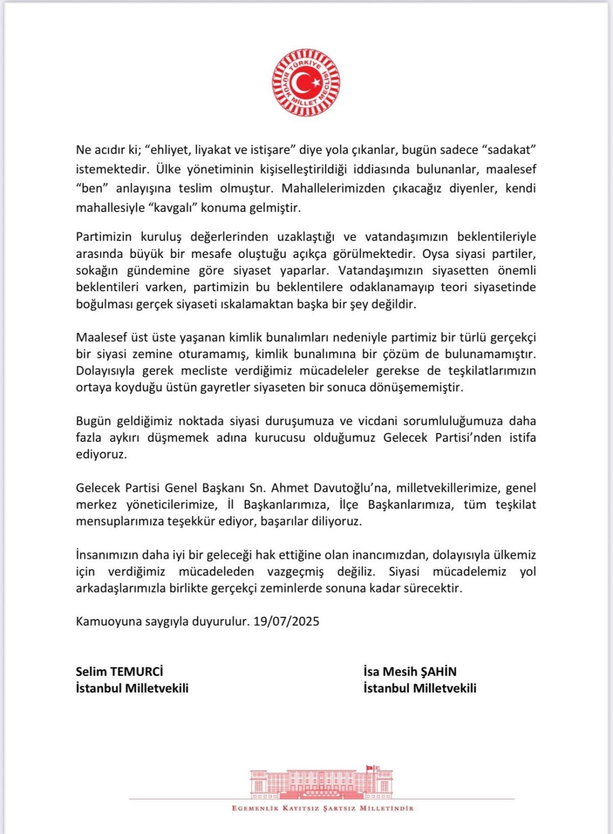 Temurci ve Şahin, “Büyük umutlarla kurduğumuz Gelecek Partisi’nin Türkiye için yeni bir gelecek inşa etmesi artık imkansız hale gelmiştir. Kuruluş devrinde oluşan güçlü takım ve teşkilat yapısı bugün prestijiyle konjonktürel bir yapıya evrilmiştir. Partinin isminden dahi vazgeçilerek siyasi hesaplara nazaran hareket edildiğini görüyoruz” sözlerine yer verdi.
