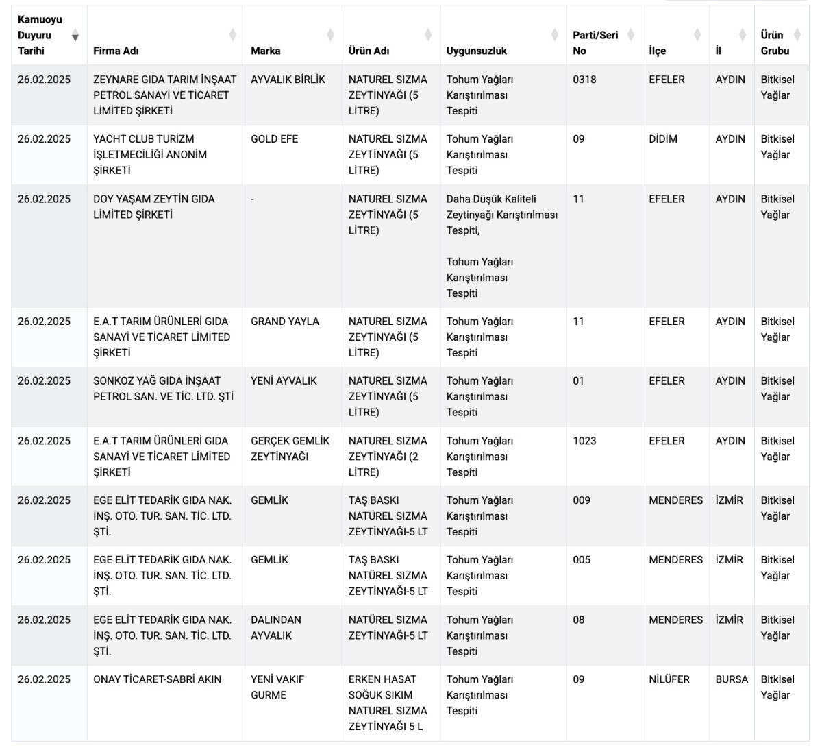 Bu listede naturel sızma zeytinyağına, tohum yağları ve daha düşük kaliteli zeytinyağı karıştırıldı.