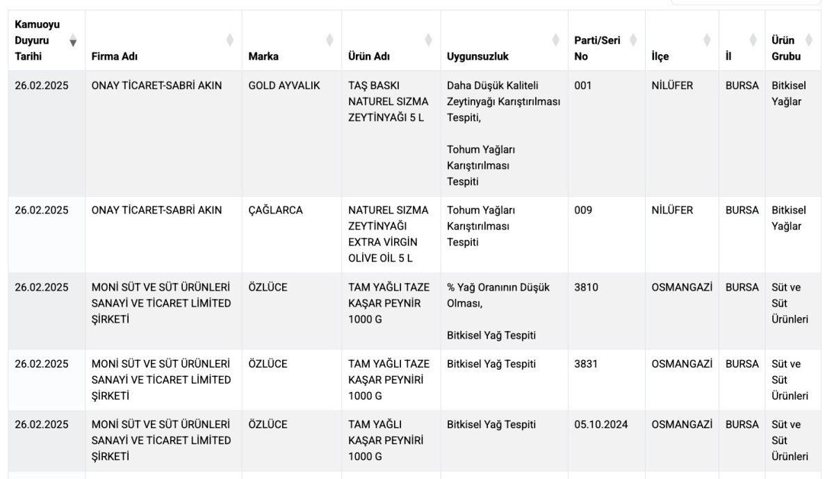 Taklit veya Tağşiş Yapılan Gıdalar ikinci listeye ise 5 yeni firma katılarak buradanki sayı da 86’ya yükseldi.