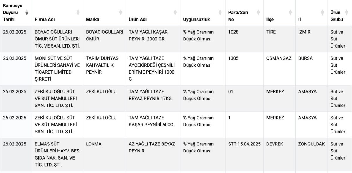 Burada da tüm yağlı kaşar peynirinde, tam yağlı ayçekirği çeşnili eritme peynirinde ve tam yağlı beyaz peynirde yağ oranı düşük çıktı.