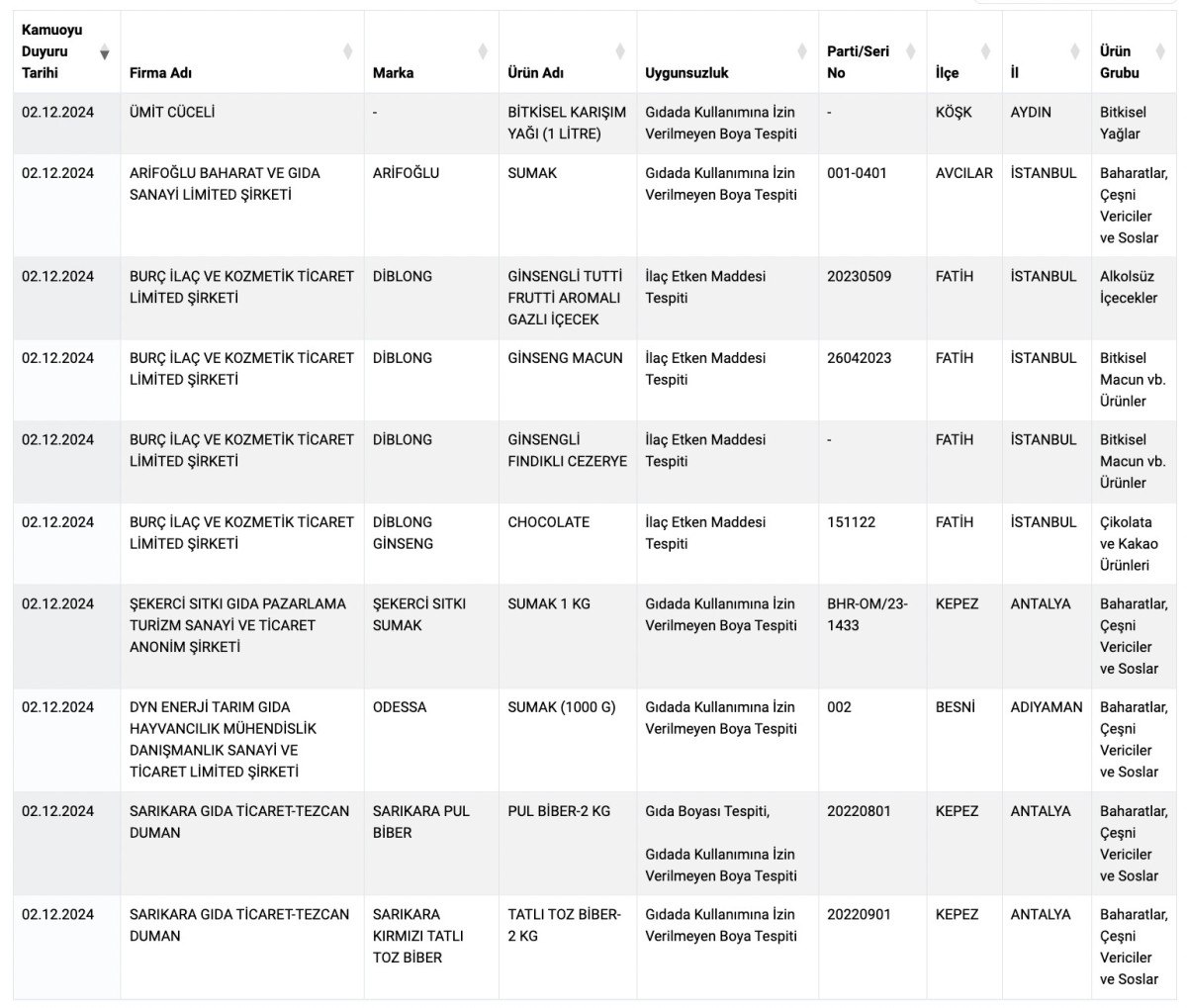Tarım ve Orman Bakanlığı, Sağlığı Tehlikeye Düşürecek Gıdalar listesi yenilendi. Listeye 10 ürün daha girdi ve sağlıksız ürün sayısı 168 oldu.