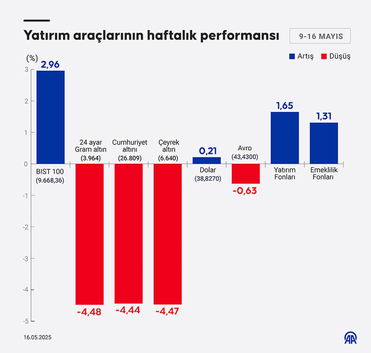 Bu hafta öbür yatırım araçlarından dolar/TL yüzde 0,21 artış, euro/TL yüzde 0,63, altının gram fiyatı yüzde 4,48 azalış kaydetti.