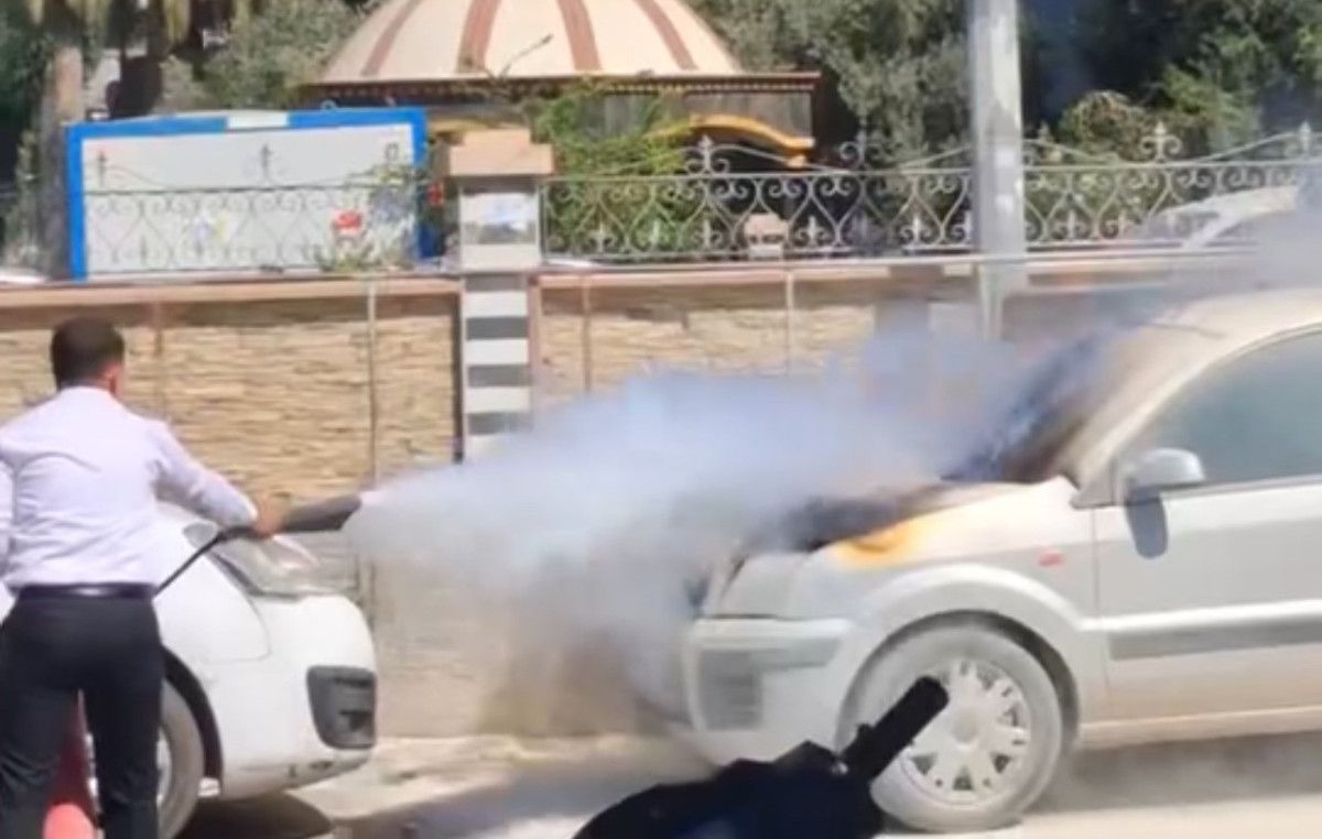 Cadde üzerinde park halindeki bir arabanın motor kısmından şimdi bilinmeyen nedenle dumanlar yükselmeye başladı.