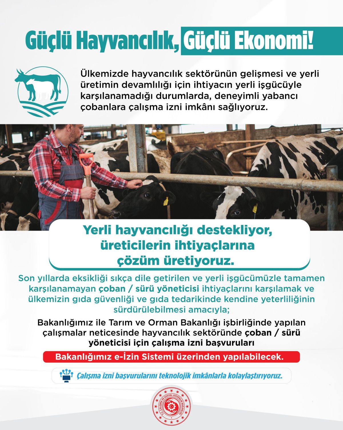 Bu kapsamda Tarım ve Orman Bakanlığı iş birliğinde hayvancılık bölümünde büyükbaş yahut küçükbaşı bulunan ve ‘Hayvan Bilgi Sistemi’ne kayıtlı hayvancılık işletmelerinde istihdam edilecek çobanlara ve hayvan bakıcılarına ait çalışma müsaadesi müracaatlarının değerlendirilmesinde belirlenen kriterler kapsamında çalışma müsaadesi müracaatları 12.06.2025 tarihi prestijiyle alınmaya başlanmıştır.