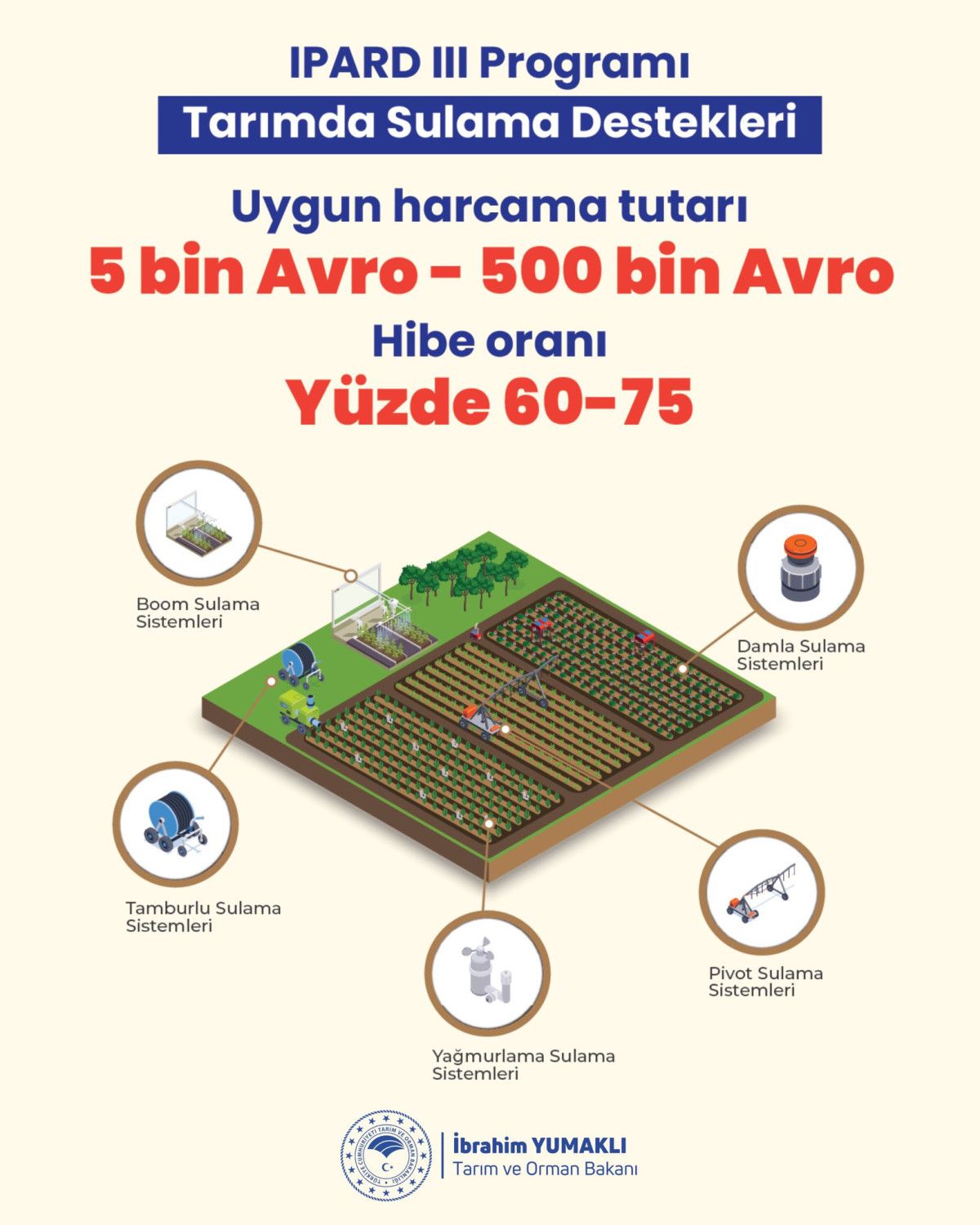 Tarım ve Orman Bakanı İbrahim Yumaklı, IPARD III Programı kapsamında sulama sistemlerine hibe verildiğini belirterek, “Bu kapsamda, 500 bin euroya kadar uygun harcamaların yüzde 75’ine kadar hibe takviyesi sağlıyoruz.” tabirini kullandı.