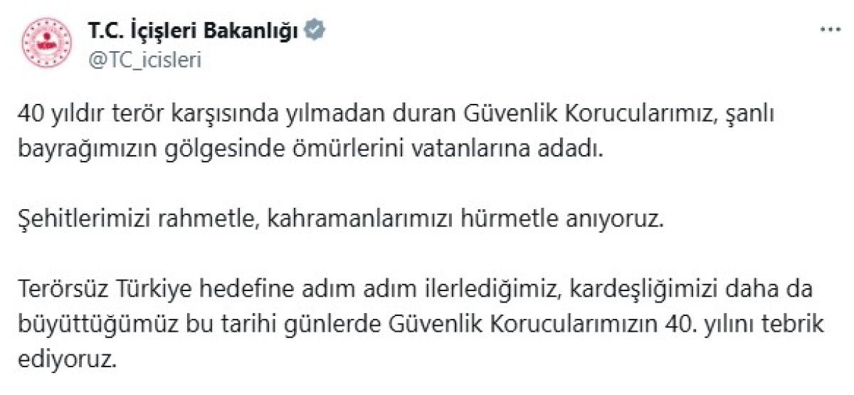 İçişleri Bakanlığı’nın toplumsal medya hesabından yayımlanan iletide, şu tabirlere yer verildi: