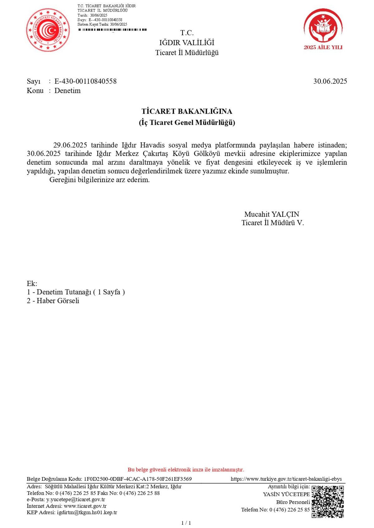 29 Haziran 2025 tarihinde toplumsal medyada ‘Iğdır’da kayısı 1 TL İstanbul’da 120 TL satılıyor’ biçiminde yapılan paylaşımlar üzerine, Ticaret Bakanlığımızın kontrol takımları 30 Haziran 2025 tarihinde Iğdır Merkez’de gerekli incelemeleri başlatmıştır.