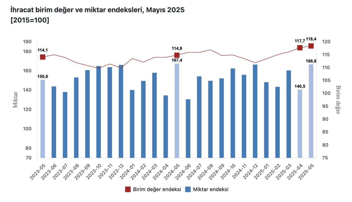 Mevsim ve takvim tesirlerinden arındırılmış seriye nazaran ihracat ölçü endeksi; 2025 Nisan ayında 143,7 iken 2025 Mayıs ayında yüzde 12,6 oranında artarak 161,8 oldu. Takvim tesirlerinden arındırılmış seriye nazaran ise ihracat ölçü endeksi; 2024 yılı Mayıs ayında 158,6 iken 2025 yılı Mayıs ayında yüzde 3,6 oranında artarak 164,3 oldu.