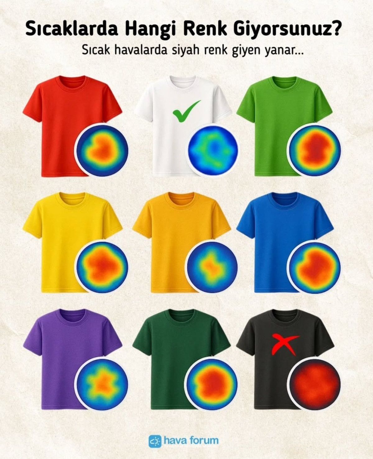 Koyu renk kıyafetler, güneş ışınlarını daha fazla emer ve beden sıcaklığını artırır. Bu nedenle açık renk, bol ve pamuklu kıyafetler tercih edilmeli.