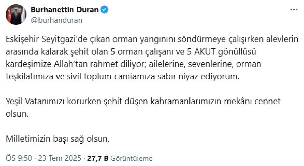 Cumhurbaşkanlığı İletişim Başkanı Burhanettin Duran, sosyal medya hesabından yaptığı paylaşımda, Eskişehir Seyitgazi’de çıkan orman yangınını söndürme çalışmalarında hayatını kaybeden 5 orman çalışanı ile 5 AKUT gönüllüsünü rahmetle andı.
