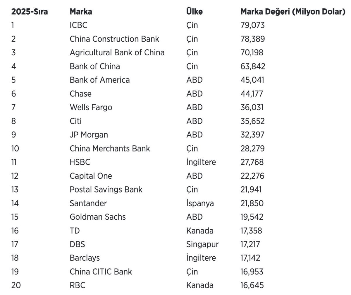 Dünyanın en değerli 500 bankası listesinde ilk 20 şöyle sıralandı: