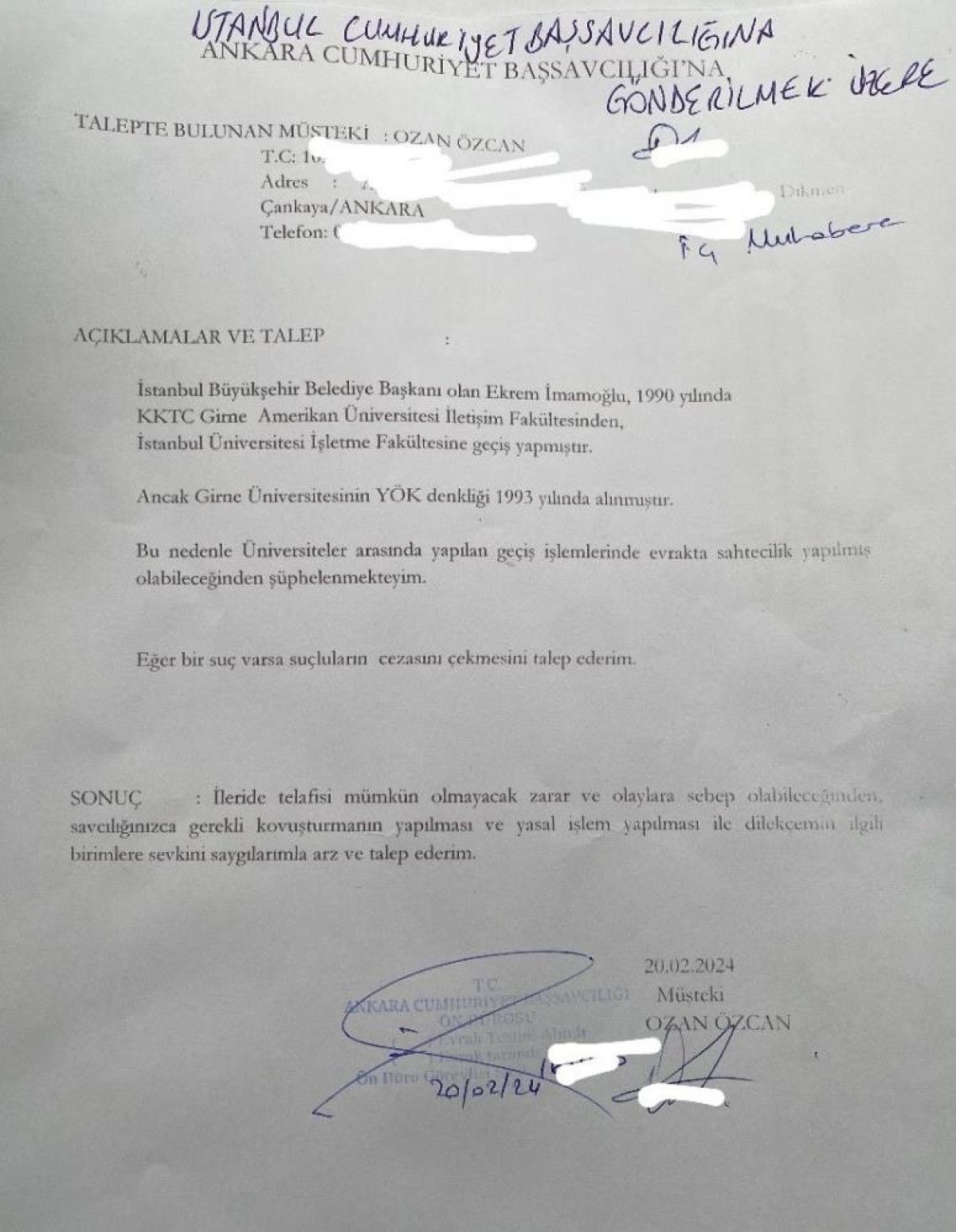 Bu durumun usulsüzlük ihtimali taşıdığını düşünen Özcan, 20 Şubat 2024 tarihinde Belediye Başkanı İmamoğlu hakkında ‘evrakta sahtecilik’ teziyle savcılığa hata duyurusunda bulundu. Hata duyurusunun akabinde çeşitli silahlı tehdit bildirileri aldığını söyleyen Özcan, İstanbul Üniversitesi’nin diploma iptal kararını memnuniyetle karşıladığını belirtti.