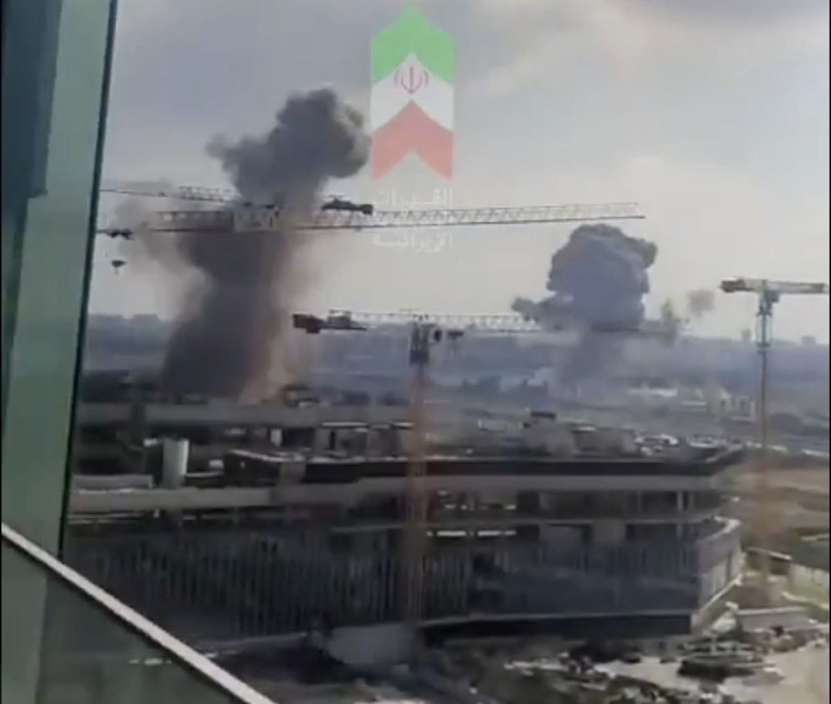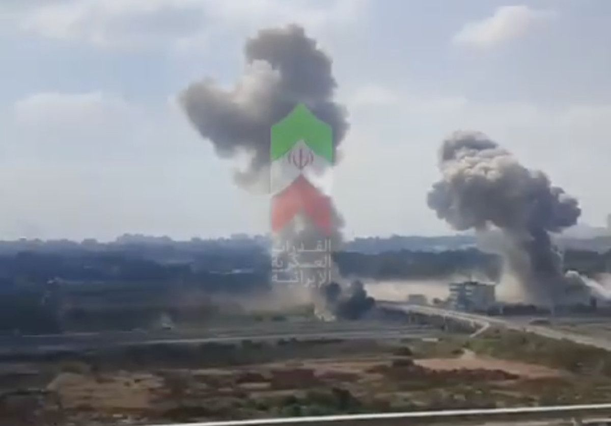 Görüntülerde İsrail hava savunma sisteminin birkaç füzeyi düşmeden ihmal etmesine karşılık en az 4 füzenin karargaha isabet ettiği görülüyor.