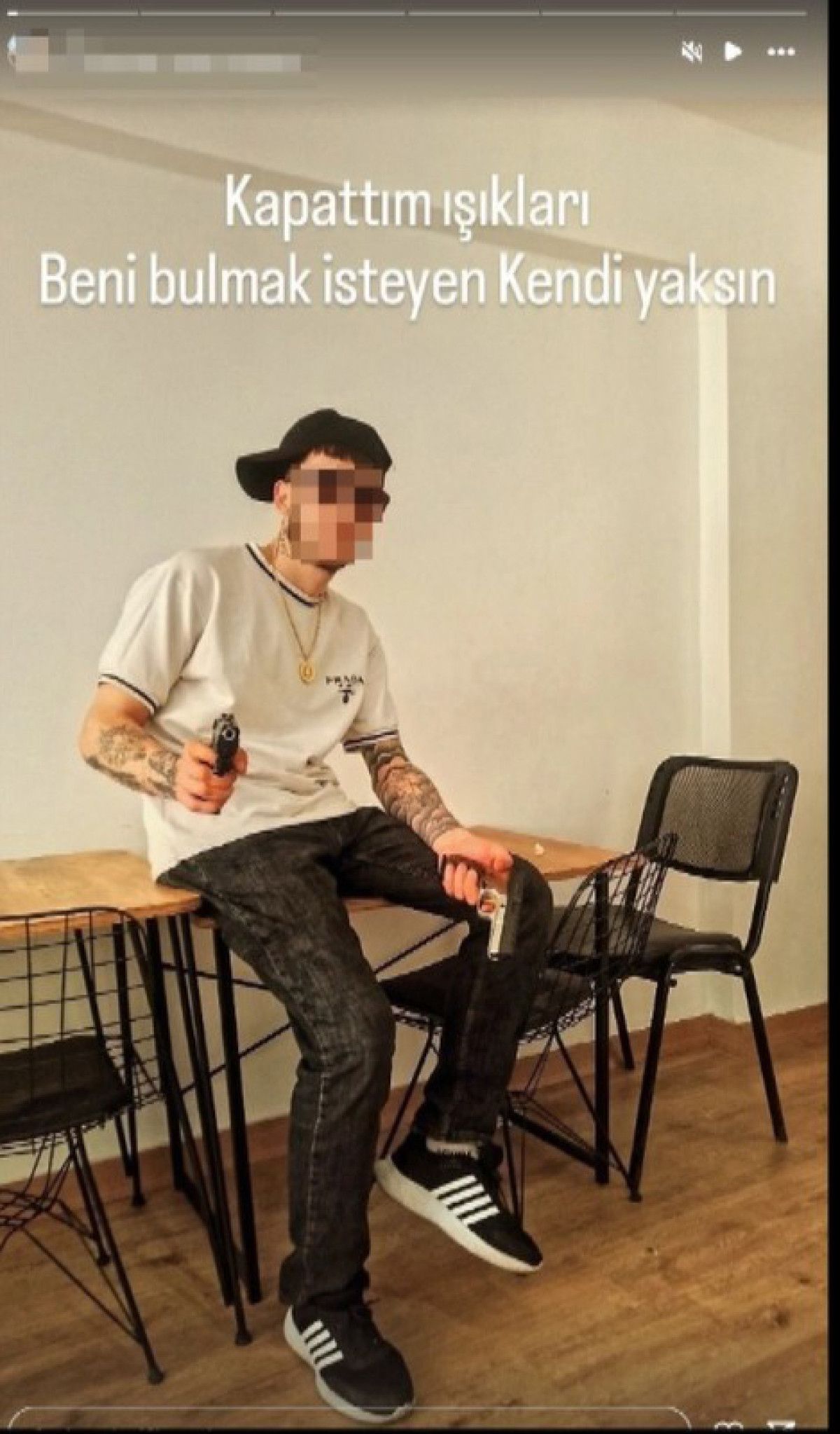Şüphelinin elinde silahla çekilen fotoğraflarını paylaştığı ve bunlardan birinin üzerine “Kapattım ışıkları. Beni bulmak isteyen yaksın” yazdığı görüldü.
