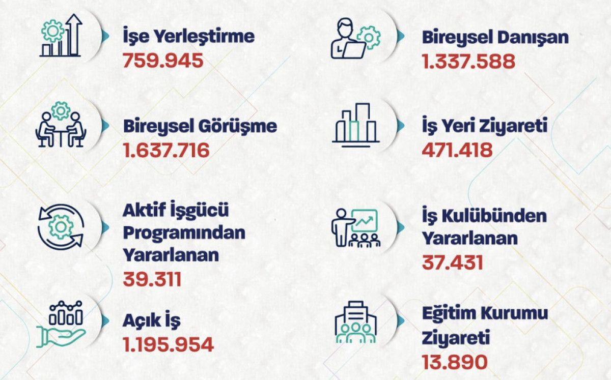 Ocak-haziran aylarında toplam 759 bin 945 işe yerleştirmeye aracılık ettik. 1,6 milyondan fazla ferdî görüşme ve 471 bin 418 iş yeri ziyareti gerçekleştirdik. 1,2 milyona yakın açık iş (işveren tarafından talep edilen-ihtiyaç duyulan eleman) tespit ettik.