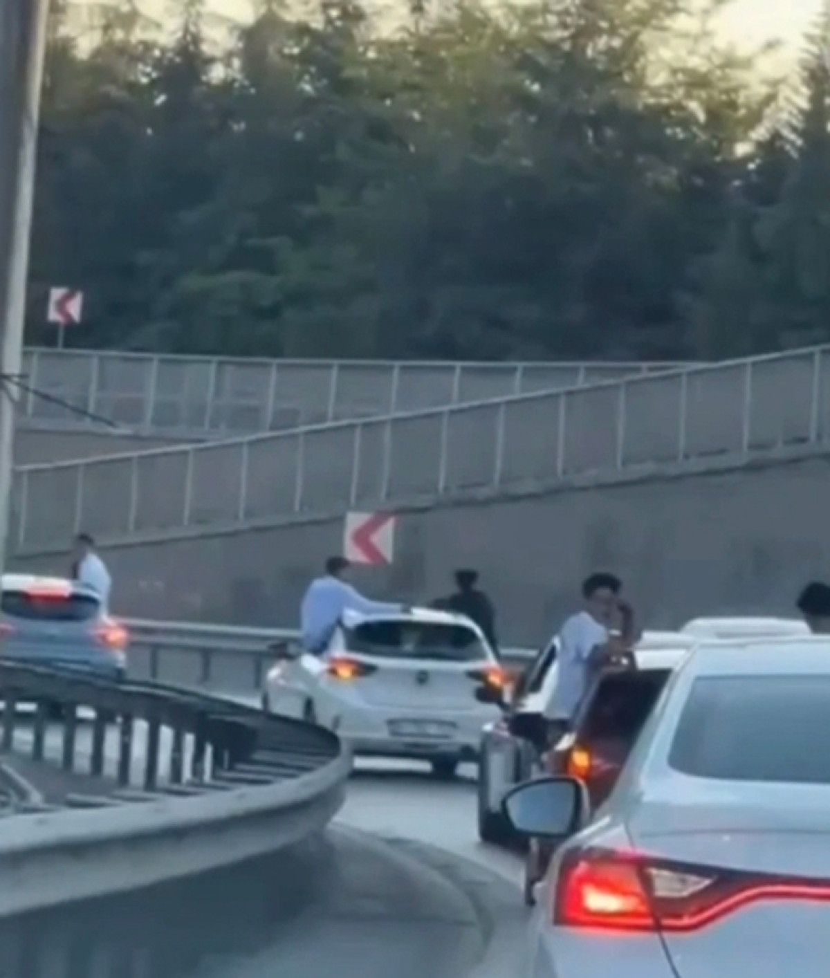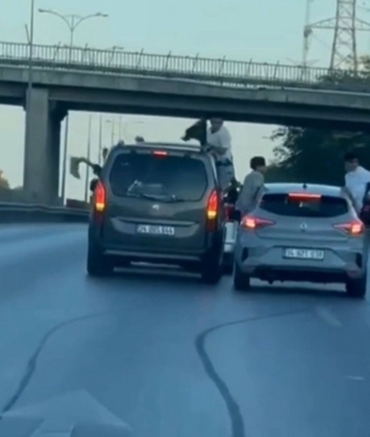 Camlarından sarkan bireylerle birlikte trafikte tehlikeli biçimde seyreden konvoydaki araçlar çarpışmaktan son anda kurtuldu.