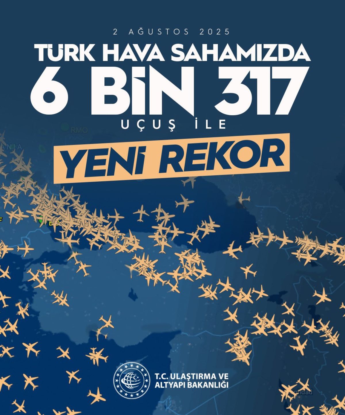 2 Ağustos 2025 tarihinde, Türk hava alanımızda gerçekleşen 6 bin 317 uçuş ile günlük trafik rekoru kırıldı.