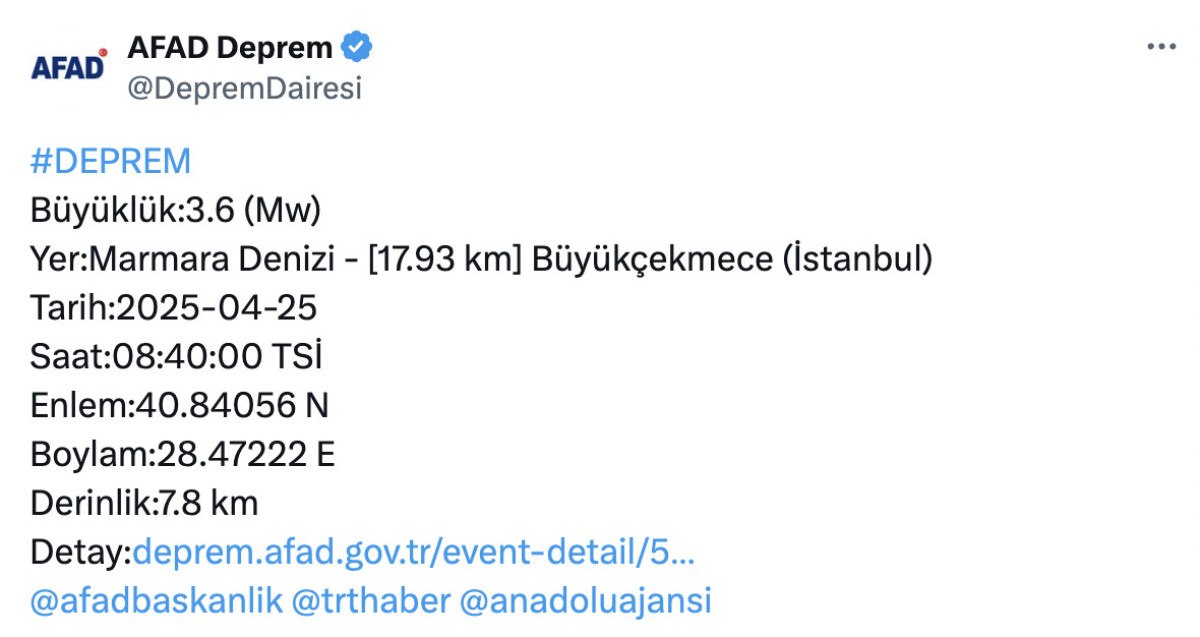 İstanbul’da saat 08.40 sıralarında hissedilen bir deprem daha meydana geldi…