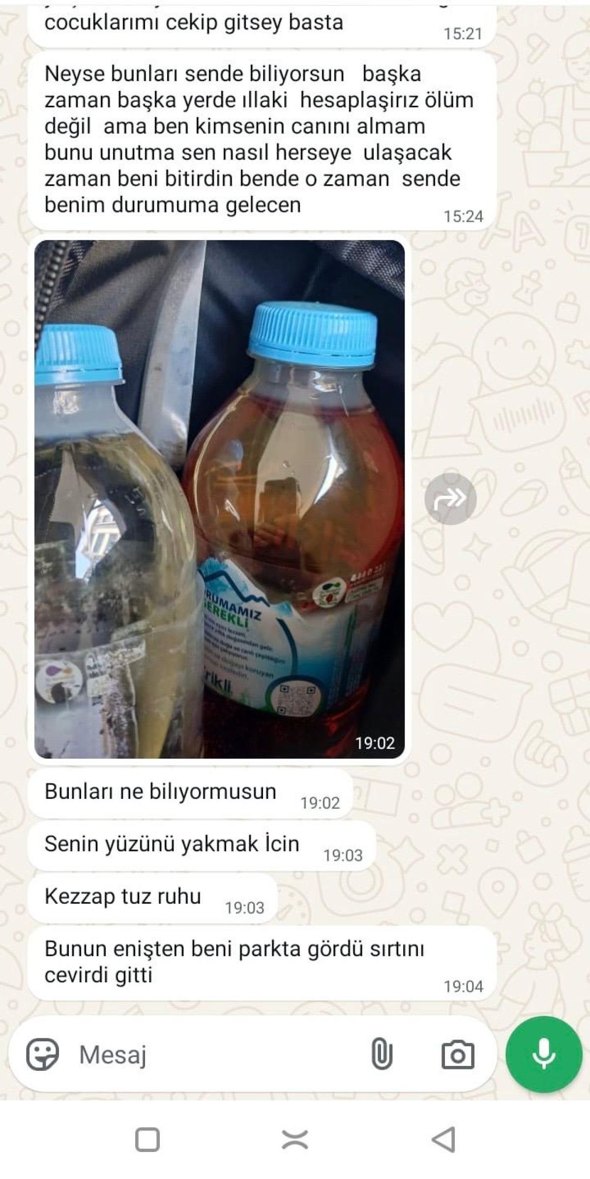 Ben ailemle yaşamaktayım. Bugün ailemin meskenine gelerek camda babamla konuşup onu oyalayıp dışarı çağırıyor. Babam ona güvenip dışarıya çıkmıyor. Babam dışarıya çıkmadığı için babamın yüzüne kezzap atıyor. Kız kardeşim siper oluyor o da kollarından yaralanıyor. Ben meskende olsaydım o kezzap suyuyla benim yüzümü yakacaktı.