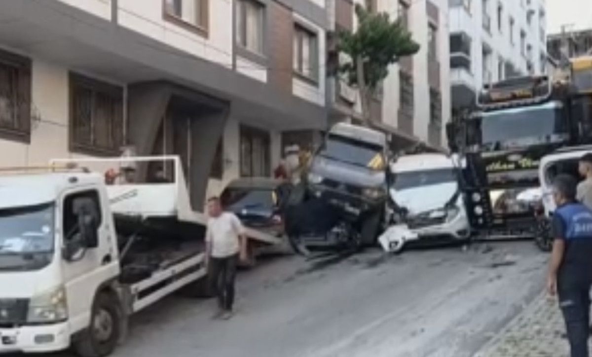Yokuş aşağı denetimden çıkan tonlarca yükteki vinç, park halindeki çok sayıda aracı önüne katıp sürükledi.
